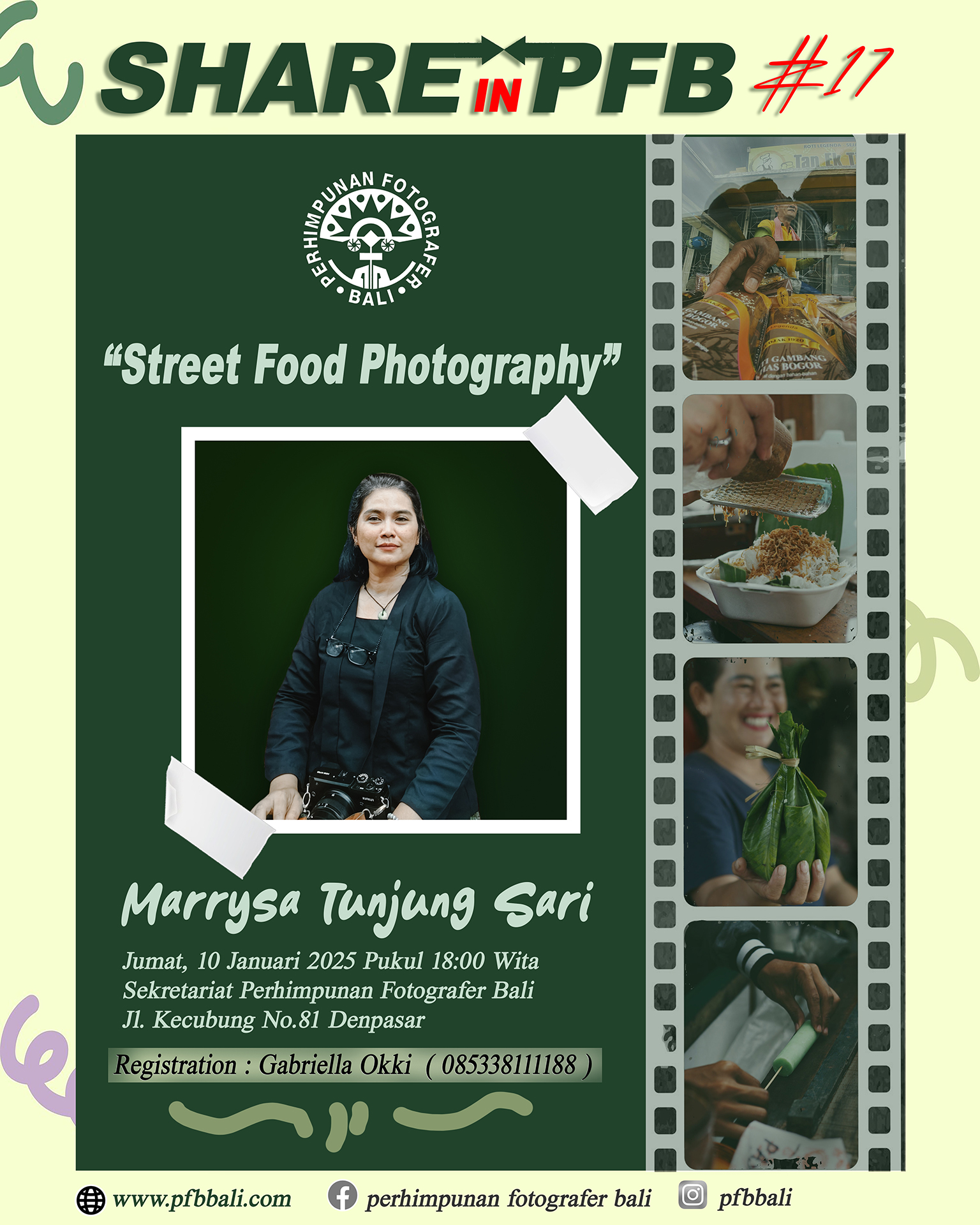 Keseruan acara “Share In PFB” dengan narasumber kakak Marrysa Tunjung Sari @poeticpicture yang telah membagikan pengalaman seru nya dalam memotret Street Food, pada Jumat, 10 Januari 2025 yang diadakan di Sekretariat PFB.